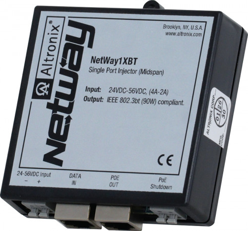 Altronix NetWay1XBT single port 802.3bt compliant power injector provides power and passes data (e.g. video) for PoE compliant devices.