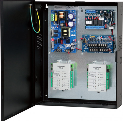 Altronix T1SAK3F4D kit consists of Trove1 enclosure, TSA1 Salto/Altronix backplane with one (1) 12VDC or 24VDC @ 6A power supply/charger, one (1) PTC access power controller, one dual input PTC power distribution module and one (1) voltage regulator. This kit also accommodates up to two (2) Salto CU42E0, CU4200 or CU4EB8 modules for up to four (4) doors in a single enclosure. Trove simplifies board layout and wire management, reduces installation time and labor costs.