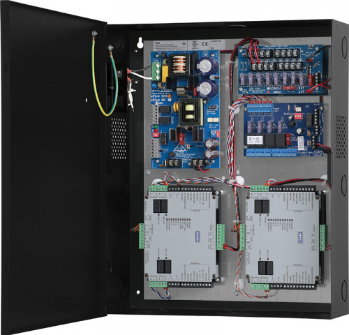 Altronix T1V3CK1 is a 4-door access and power integration kit which includes Altronix power and sub-assemblies along with factory installed wire management and wire assemblies that are pre-configured with terminal blocks for HID Aero modules. This unit provides ample power and dual voltage outputs to support HID Aero platform controllers and locking devices. The T1V3CK1 accommodates one (1) X1100 Intelligent Controller and one (1) X100 Input Monitor Interface Module. Trove Plus simplifies field installations and provides reliable, robust critical power and control for the most demanding applications.