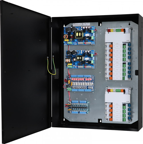 Altronix T2AXK75F12 kit consists of Trove2 enclosure, TAX2 Axis Communications/Altronix backplane with one (1) 24VDC @ 10A and one (1) 12VDC @ 10A power supply/charger, one (1) twelve (12) fuse protected dual input/output access control module, and one (1) sixteen (16) fuse protected dual input/output power distribution module. This kit also accommodates one (1) A1810-B and one (1) A1710-B for up to twelve (12) doors in a single enclosure. Trove simplifies board layout and wire management, reduces installation time and labor costs.