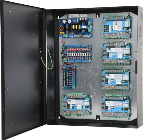 Altronix T2CSK7F10D kit consists of Trove2 enclosure, TCV2 backplane with one (1) 24VDC @ 10A power supply/charger, one (1) twelve (12) PTC protected dual input/output access control module, one (1) 12VDC voltage regulator and one (1) eight (8) PTC protected dual input/output power distribution module. This kit also accommodates up to five (5) iNet for up to ten (10) doors in a single enclosure. Trove simplifies board layout and wire management, reduces installation time and labor costs.
