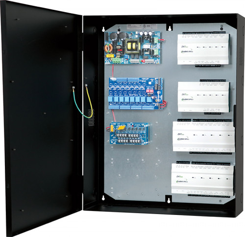 Altronix T2ZK7F8D kit consists of Trove2 enclosure, TDR2 ZKTeco/Altronix backplane with one (1) 24VDC @ 10A power supply/charger, one (1) PTC access power controller, one (1) voltage regulator and one (1) dual input PTC power distribution module. This kit also accommodates up to two (2) ZKTeco modules for up to eight (8) doors in a single enclosure. Trove simplifies board layout and wire management, reduces installation time and labor costs.