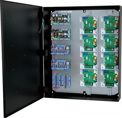 Altronix T3AXK77F16S kit consists of Trove2 enclosure, TV3 Axis Communications/Altronix backplane with two (2) 24VDC @ 10A power supply/charger, two (2) eight (8) fuse protected dual input/output access control modules, two (2) 12VDC voltage regulators and two (2) sixteen (16) fuse protected dual input/output power distribution modules. This kit also accommodates up to eight (8) A1601 or A1610 or sixteen (16) A1210 modules for up to sixteen (16) doors in a single enclosure. Trove simplifies board layout and wire management, reduces installation time and labor costs.