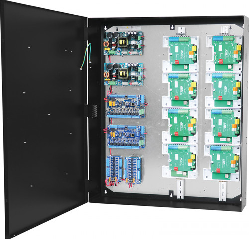 Altronix T3AXK77F16SDQ kit consists of Trove2 enclosure, TV3 Axis Communications/Altronix backplane with two (2) 24VDC @ 10A power supply/charger, two (2) eight (8) PTC protected networked dual input/output access control modules, two (2) 12VDC voltage regulators and two (2) sixteen (16) PTC protected dual input/output power distribution modules. This kit also accommodates up to eight (8) A1601 or A1610 or sixteen (16) A1210 modules for up to sixteen (16) doors in a single enclosure. Trove simplifies board layout and wire management, reduces installation time and labor costs.