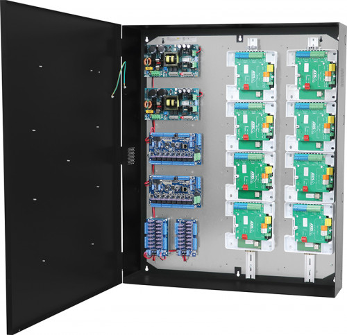 Altronix T3AXK77F16SQ kit consists of Trove2 enclosure, TV3 Axis Communications/Altronix backplane with two (2) 24VDC @ 10A power supply/charger, two (2) eight (8) fuse protected networked dual input/output access control modules, two (2) 12VDC voltage regulators and two (2) sixteen (16) fuse protected dual input/output power distribution modules. This kit also accommodates up to eight (8) A1601 or A1610 or sixteen (16) A1210 modules for up to sixteen (16) doors in a single enclosure. Trove simplifies board layout and wire management, reduces installation time and labor costs.